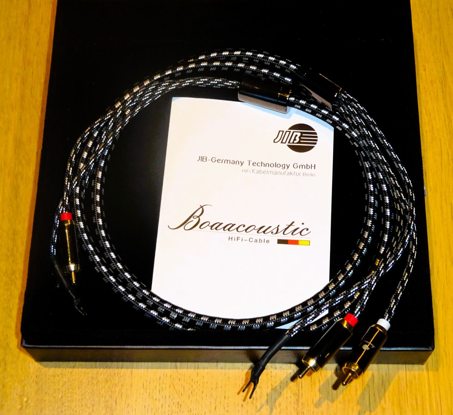 Fraaie phono interlink van het Duitse merk Boaacoustic met verzilverd koperen geleiders met carbonvezelafschering in de mantel, afgemonteerd met vergulde carbon connectoren, 1,5 meter lange uitvoering. In perfecte staat, wordt geleverd in de originele verpakking.