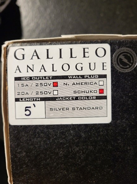 Voormalig topmodel powercord van Synergistic Research 1,5 meter lange uitvoering met diverse baanbrekende technologieën zoals: Gold and Silver SRX Carbon Tuning Circuits (twee tuning pluggen waarmee het klankkarakter naar wens ingesteld kan worden), een actieve DC-gevoede afscherming (middels meegeleverde adapter) verder is deze Galileo kabel voorzien van UEF-technologie (oorspronkelijk ontwikkeld voor Purple Fuses).